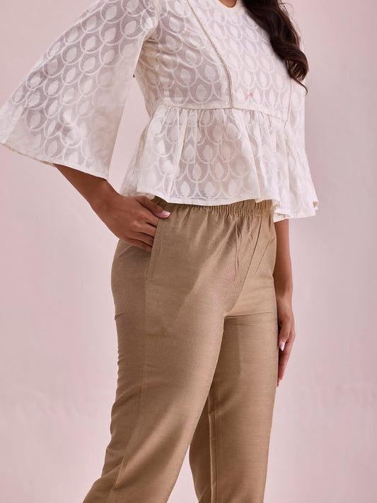 Chic Beige Cropped Pants with White Embroidered Top
