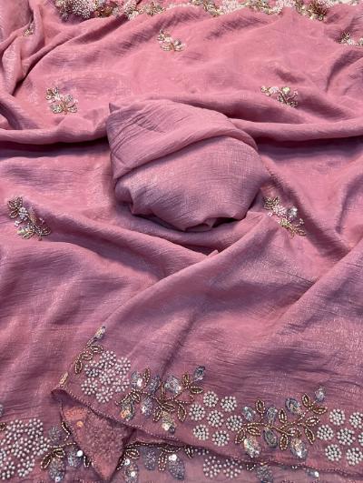 Introducing the exquisite Pixel Crush Sequins Saree – a true embodiment of glamour and artistry. Crafted in a captivating shade of dusty rose, this saree features a unique fabric with a subtle, reflective shimmer that catches the light beautifully. It's designed for those who seek a blend of traditional charm and contemporary allure, perfect for making a sophisticated statement at any grand occasion.
